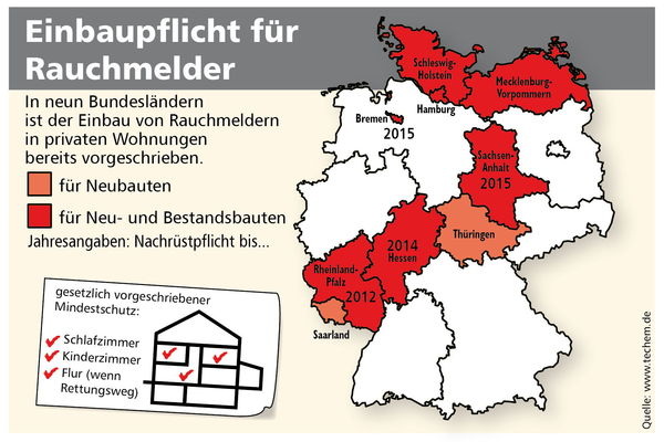 Da Baurecht in Deutschland Ländersache ist (Landesbauordnung), sind die Regelungen bezüglich der Einbaupflicht von Rauchwarnmeldern uneinheitlich. Aktuell haben neun Bundesländer – Hessen, Rheinland-Pfalz, das Saarland, Schleswig-Holstein, Hamburg, Mecklenburg-Vorpommern, Thüringen, Bremen und Sachsen-Anhalt – eine Rauchwarnmelderpflicht für private Wohnräume. Weitere Bundesländer werden folgen. Die Umfrage aber zeigt: 71 % der Bürger wissen nichts von dieser Regelung. In den neun Bundesländern mit Rauchwarnmelderpflicht ist der Anteil derer, bei denen zuhause Rauchwarnmelder installiert sind, mit 63 versus 46 % höher als in den anderen Bundesländern. Auch hier ist die Ausstattung von flächendeckend weit entfernt. Techem bietet für Rauchwarnmelder einen kompletten Service: www.techem.de/rauchwarnmelder