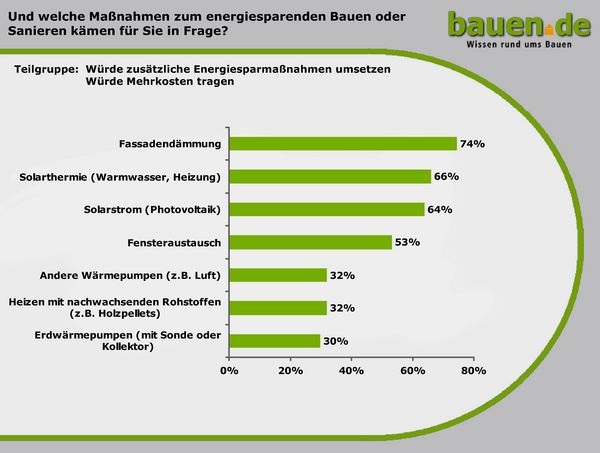 Neben der Fassadendämmung und den Solaranlagen können sich die Befragten auch für neue Fenster (53 %) erwärmen. Erstaunlich hoch ist die Häufigkeit der Nennungen der Wärmepumpen-Technologie: 32 % könnten sich vorstellen, in eine Luft-Wärmepumpe zu investieren, für 30 % ist eine Erd-Wärmepumpe denkbar, gleichauf rangieren Heizsysteme auf der Basis nachwachsender Rohstoffe (z.B. Holz-Pelletheizkessel). Gleichwohl liegen die Umfrageergebnis voll im Trend: Im Wärmeerzeugermarkt gewinnt die Wärmepumpe sehr schnell Anteile (Bericht auf TGAonline: Erdgas verliert Markt an Wärmepumpe)