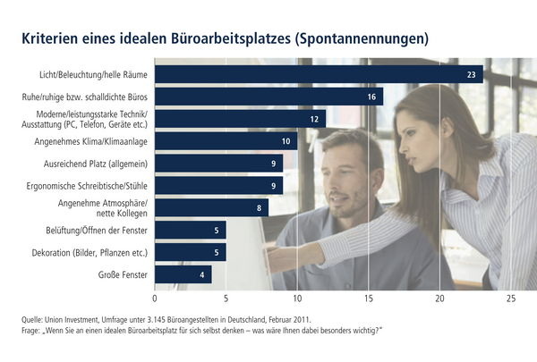 1) Für die Studie befragte das Marktforschungsinstitut Ipsos im Auftrag von Union Investment im Februar 2011 online-repräsentativ Büroangestellte in Deutschland, die in Büroräumen von privatwirtschaftlichen Unternehmen und Institutionen tätig sind und einen überwiegend Teil ihrer Arbeitszeit in ihrem Büro verbringen. Insgesamt wurden 3145 Online-Interviews durchgeführt. Befragt wurden Büronutzer aus den Branchen Beratung (289), Gesundheitswesen (262), IT/Telekommunikation (208), Vertrieb/Handel (469), Information/Kommunikation (313), Finanzen/Versicherungen (322), Versorger (55), Transport/Logistik (178), Herstellung/Produktion (559), Wissenschaftliche und technische Dienstleistung (302) und Sonstige (188).