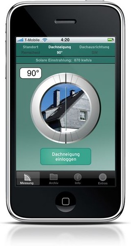 Im nächsten Schritt kann der Benutzer die Himmelsrichtung der geplanten Solaranlage bestimmen. Dazu stellt er sich mit dem Rücken zur Hauswand unter die in Frage kommende Dachseite. Ein Kompass zeigt die aktuelle Himmelsrichtung an. Durch eine Bestätigung wird der ermittelte Wert der Himmelsrichtung in die Berechnung übernommen.
