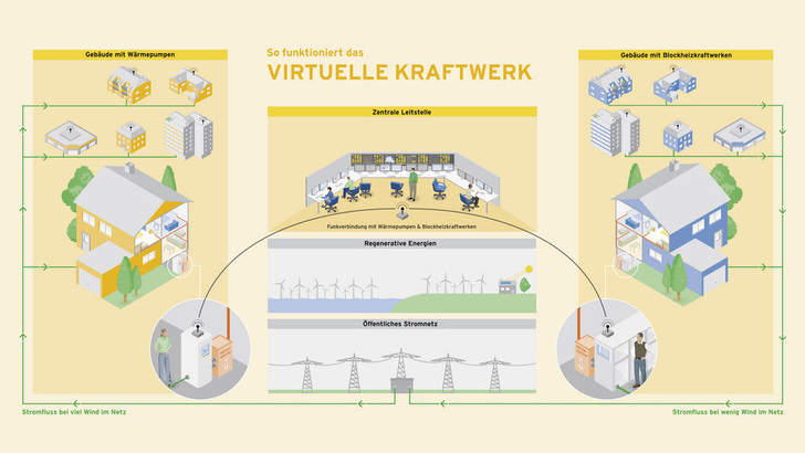 Das Virtuelle Kraftwerk kombiniert BHKW und Wärmepumpen zu einem vernetzten, flexibel regelbaren und zentral gesteuerten Anlagensystem. Es ist das erste Kraftwerk, das während der Wärmeproduktion sowohl in der Lage ist mit den BHKW Elektrizität zu produzieren, als auch über die Wärmepumpen gezielt regenerativen Strom zu verbrauchen. Die zentrale Steuerung kann beispielsweise bei Windstromüberschuss im Netz die Wärmepumpen aktivieren, die dann den Windstrom in Wärme umwandeln, die bis zum Verbrauch gespeichert wird. Nach Auskunft von Dr. Frank May, Vorstandsvorsitzende der Vattenfall Europe Wärme AG, läuft die Kommunikations- und Steuerungstechnik zuverlässig. Unternehmensziel ist es, bis Ende des Jahres 100.000 Wohneinheiten über das Virtuelle Kraftwerk mit Wärme zu versorgen. ■