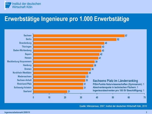 „In Folge alternder Belegschaften werden ab 2018 rund 44.000 Ingenieure jährlich in den Ruhestand gehen“, so Dr. Hans-Peter Klös, Geschäftsführer des IW Köln. „Die Entwicklung zu einer forschungs- und wissensintensiven Gesellschaft erzeugt darüber hinaus einen zusätzlichen Bedarf an Ingenieuren, der schon heute nicht mehr gedeckt werden kann.“ Die Anzahl junger Ingenieure reicht in Zukunft nicht mehr aus, um allein die altersbedingt aus dem Erwerbsleben Ausscheidenden zu ersetzen. Auf 347.000 Ingenieure im Alter von 56 bis 65 Jahren kommen in Deutschland 343.000 Ingenieure im Alter von bis zu 35 Jahren. Angesichts der in Zukunft sinkenden Gesamtstudierendenzahlen seien beträchtliche Anstrengungen notwendig, um der weiteren Verschärfung des Ingenieurengpasses entgegenzuwirken.