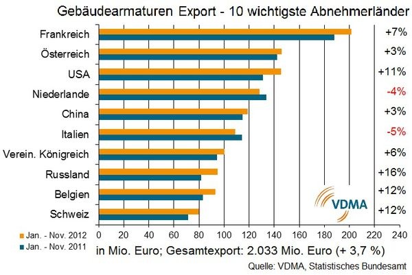 Europaweit betrachtet halten die Euro-Krise und die anhaltend schwierige Lage der Weltwirtschaft das Baugeschehen allerdings weiterhin in Atem. In seiner aktuellen Studie rechnet Euroconstruct insgesamt mit einem Rückgang der Bauaktivitäten von 4,7 % für das Jahr 2012. Nach Angaben des Statistischen Bundesamts stieg der deutsche Export von Gebäudearmaturen von Januar bis November 2012 um rund 4 % auf mehr als 2,03 Mrd. Euro. Frankreich und Österreich behaupteten ihre Position als „Top zwei Absatzmärkte“ für Gebäudearmaturen, die Niederlande gab mit einem Minus von knapp 4 % den dritten Platz des Exportrankings an die USA ab.