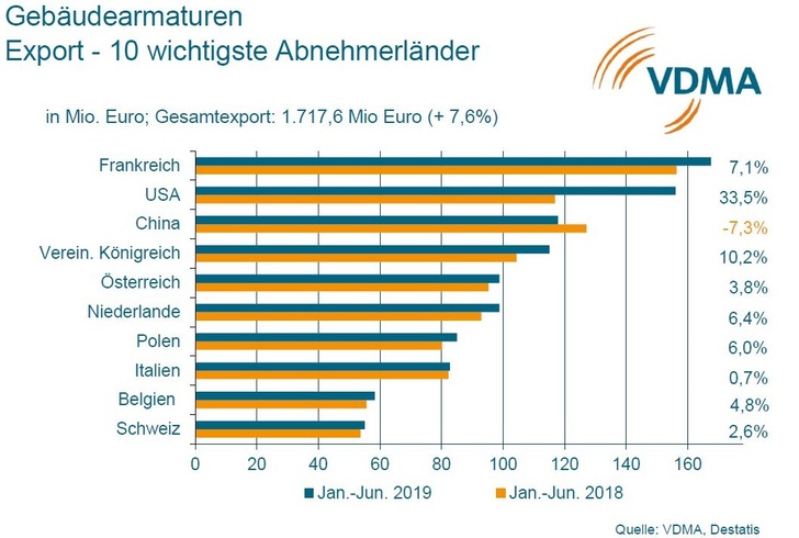 Die USA belegten erneut den zweiten Platz der wichtigsten Exportmärkte und konnten sich gegenüber dem Vorjahr um rasante 33,5 Prozent verbessern. Die Lieferungen deutscher Gebäudearmaturen in die USA erreichten im 1. Halbjahr 2019 einen Wert von 156,1 Mio. Euro. Die amerikanische Baubranche befindet sich immer noch in einer Phase der Hochkonjunktur und die Konsumenten investieren in hochwertige Häuser. Insgesamt wird 2019 und 2020 allerdings eine leichte Abschwächung im Gleichklang mit der allgemeinen Wirtschaftsentwicklung in den Vereinigten Staaten erwartet.