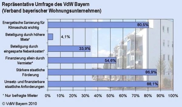 80,5 % der Deutschen sind der Meinung, dass energetische Sanierungen von Mietwohnungen wichtig für den Klimaschutz sind. Allerdings kommt nur für 4,1 % der Mieter in Frage, dafür eine höhere Miete zu bezahlen. Auch die Bereitschaft, sich mit einem Teil der eingesparten Nebenkosten an den Investitionen des Vermieters zu beteiligen, ist gering: Dazu wäre ein Drittel bereit (33,9 %). Mehr als die Hälfte der Mieter (54,6 %) sieht die Finanzierung allein beim Vermieter. Das geht aus einer aktuellen Repräsentativ-Umfrage der GfK Marktforschung im Auftrag des Verbandes bayerischer Wohnungsunternehmen (