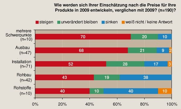 Hersteller aus den Bereichen Rohbau, Ausbau, Installation und Rohstoffe nach ihren Erwartungen für die eigenen Produkte gefragt. Die Tendenz ist eindeutig: Dass die eigenen Produkte teurer werden, erwarten 68% der Hersteller aus dem Bereich Ausbau und jeder zweite Hersteller (52%) mit Schwerpunkt Installation. Geteilter fallen die Einschätzungen im Bereich Rohbau aus: 43% der Hersteller in diesem Segment rechnen damit, dass sie ihre Produktpreise anheben werden, doch 38% der Rohbauprodukthersteller gehen davon aus, dass die Preise für ihre Produkte im Jahr 2009 sinken werden.