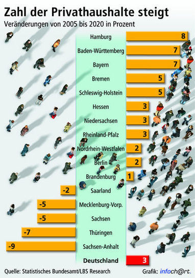 Die regionale Verteilung der Haushaltszahlen macht nach Angaben von LBS Research zugleich den hohen Einfluss der Binnenwanderung deutlich. Die Menschen leben dort, wo Wirtschaftskraft und Arbeitsplätze wachsen. Die besten Voraussetzungen für die Ansiedlung von Menschen in den nächsten 15 Jahren sehen die amtlichen Prognostiker offensichtlich nicht im Umland, sondern in den Ballungsräumen selbst. So weist die Wachstumsrate der Haushalte im Stadtstaat Hamburg mit 8% innerhalb von nur 15 Jahren den Spitzenwert aus, und auch Bremen liegt mit 5% noch vor Niedersachsen (3%). Von den Flächenländern liegen Baden-Württemberg und Bayern mit einem Plus von 7% an der Spitze, gefolgt von Schleswig-Holstein (5%). In Westdeutschland prognostizieren die Demografen nur für das Saarland ein geringfügiges Minus von 2%. Deutlicher sind dagegen die Haushalts-Verluste in den neuen Ländern - mit Ausnahme der leicht positiven Entwicklung in Berlin und Brandenburg.