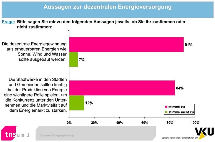 ) hat die Ergebnisse einer repräsentativen Umfrage von TNS Emnid zur Energiegewinnung in Deutschland vorgestellt. Gegenstand der Umfrage waren Fragen zur Energieerzeugung. VKU-Hauptgeschäftsführer Hans-Joachim Reck: „Die Deutschen wollen zu 68 % eine dezentrale Stromerzeugung durch regionale und örtliche Energieunternehmen.“ 91 % wollen, dass die dezentrale Stromerzeugung aus Sonne, Wind und Wasser ausgebaut wird. Eindeutig sind auch die Ergebnisse, wenn es um die künftige Bedeutung der Stadtwerke am Energiemarkt geht: 84 % der Bevölkerung wollen mehr Marktvielfalt und Wettbewerb und verlangen deshalb, dass Stadtwerke künftig eine wichtigere Rolle spielen sollen. Reck: „Die Stadtwerke nehmen diese Aufgabe ernst und sind schon heute dabei, ihre Wettbewerbsposition auszubauen, aber die Politik muss uns hier ordnungspolitisch unterstützen und nicht die oligopolistischen Erzeugungsstrukturen einseitig bevorzugen.“