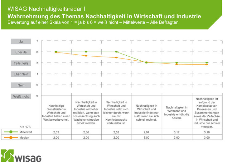 Eines der ersten Ergebnisse des Nachhaltigkeitsradars ist, dass aus Sicht von Kunden und Experten aus der Immobilienwirtschaft nachhaltige Dienstleister in Wirtschaft und Industrie einen Wettbewerbsvorteil haben. Diese These wurde auf einer Skala von 1 (ja) bis 6 (weiß nicht) mit 2 bewertet. Allerdings glauben die Befragten auch, dass Nachhaltigkeit sich leichter durchsetzen wird, wenn sie mit einem Komfortzuwachs verbunden ist (Wert: 2,36).
