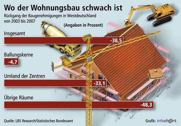 Als Ballungsräume erfasst die Statistik die Städte Hamburg, Bremen, Hannover, Stuttgart, Nürnberg und München mit ihrem Umland sowie die Gebiete Rhein-Ruhr, Rhein-Main und Rhein-Neckar. Außerhalb dieser Regionen haben sich in den letzten vier Jahren über drei Viertel des Wohnungseinbruchs in Westdeutschland abgespielt, der insgesamt von 251.500 auf 154.700 Genehmigungen zurückging. Damit entfallen mittlerweile auf die Ballungsräume 47,9% des Wohnungsneubaus, 9 Prozentpunkte mehr als noch im Jahre 2003.