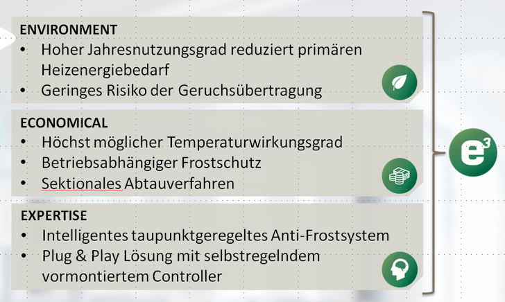 Durch Messung der Ablufttemperatur und Abluftfeuchte, der Oberflächentemperatur am Fortluft-Austritt des Gegenstromtauschers sowie der Außenlufttemperatur gekoppelt mit einem Stand-Alone Controller, wird der optimale Betriebszustand der Wärmerückgewinnung eingestellt. Über den Taupunkt in der Abluft wird die Minimaltemperatur an der „kalten Ecke“ des Platten-Wärmetauschers geregelt. Unabhängig betriebene sektionale Abtauklappen gewähren maximale Übertragungsgrade. Erst in der zweiten Phase wird die modulare Bypassklappe in den Frostschutzvorgang eingebunden. Eine deutliche Reduzierung des Betriebs über die Bypassklappe bei niedrigen Außenlufttemperaturen verbessert die Effizienz der Wärmerückgewinnung.