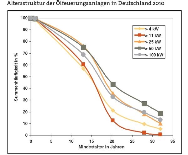 Bei den Ölfeuerungsanlagen fallen vor allem größere Anlagen, wie sie beispielsweise in Mehrfamilienhäusern eingebaut werden, durch ihr hohes Betriebsalter auf. Nachholbedarf ergibt sich daher vor allem im Bereich des Mietwohnungsbestands. Unabhängig von Eigentum oder Miete – eine veraltete Anlagentechnik oder überdimensionierte Heizkessel belasten die Bewohner mehrfach. Sie arbeiten gemessen am aktuellen Stand der Technik häufig energetisch ineffizient und verursachen dadurch höhere Kosten. ■