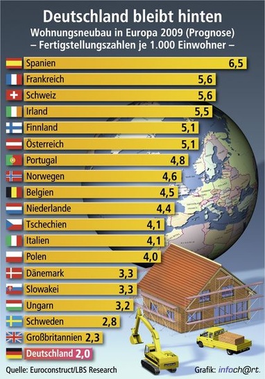 auf der Grundlage aktueller statistischer Daten sowie der Prognose von Euroconstruct mitteilt, entstehen beim Spitzenreiter des Jahres 2009, in Spanien, mit 6,5 Einheiten pro 1000 Einwohner immer noch gut dreimal so viele Wohnungen in Neubauten wie in Deutschland mit 2,0. Und mit Ausnahme Dänemarks ist die Bauintensität in allen direkten Nachbarländern mindestens doppelt so groß wie hierzulande. Der internationale Vergleich bestätigt für LBS Research, was auch durch die kürzliche LBS-Umfrage bei Forschungsinstituten deutlich wurde: Der Neubaubedarf wird längst nicht mehr gedeckt, Angebotsengpässe sind eines Tages unvermeidlich.