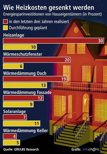 Haben Eigenheimmodernisierer bisher überwiegend in Heizungsanlagen, Fenster und Fassadendämmung investiert, stehen jetzt Dachdämmung und Solaranlagen ganz oben auf der Prioritätenliste. Dabei sind hohe Energiepreise, der Energieausweis sowie Sorgen um das Klima starke Anreize für Energiesparinvestitionen im Wohnungsbestand. Das ist das Ergebnis einer repräsentativen Befragung von Eigenheimbesitzern, die das Marktforschungsinstitut GfK im Auftrag der Landesbausparkassen (LBS) im Frühjahr durchgeführt hat. Befragt wurden Hauseigentümer, die in mindestens zehn Jahre alten Immobilien wohnen.