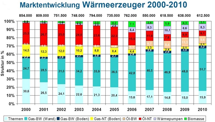 -Statistik in Deutschland mit 612.500 Wärmeerzeugern 4 % weniger als in 2009 verkauft. Insgesamt wurden 542.500 (–3 %) Wärmeerzeuger auf der Basis von Gas und Heizöl verkauft.