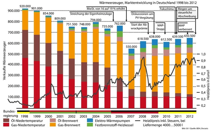 Im Gleichklang mit dem Gesamtabsatz ist die Verkaufszahl für Gas- und Öl-befeuerte Wärmerzeuger um 3 % auf 562.000 Stück gestiegen, ihr Marktanteil verringerte sich jedoch um 0,5 Prozentpunkte, 2011 gab es den gleichen Trend. Die Marktentwicklung fiel für die beiden Haupt-Energieträger im Wärmemarkt jedoch sehr unterschiedlich aus.