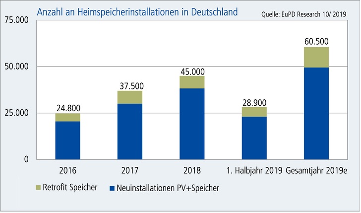 Für das erste Halbjahr 2019 errechnet EuPD Research eine Anzahl von Heimspeicherinstallationen im deutschen Markt von 28.900 Stück, wobei diese sowohl Neuinstallationen als auch Nachrüstsysteme für bestehende PV-Anlagen umfasst. Die Zahlen der vergangenen Jahre belegen, dass im zweiten Halbjahr mehr PV-Anlagen und damit einhergehend mehr Heimspeichersysteme installiert werden. Auf dieser Basis prognostiziert EuPD Research für das Gesamtjahr 2019 eine Anzahl von 60.500 Speicherinstallationen in Deutschland. Dies bedeutet ein Wachstum von einem Drittel gegenüber dem Vorjahr.
