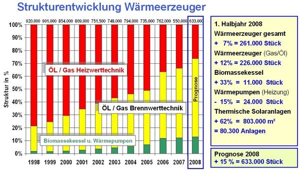 Die Verkaufszahlen im 1. Halbjahr 2008 für Wärmeerzeuger mit Öl- und Gas gibt der BDH mit 226.000 (+12%) an. In der Struktur gab es dabei eine deutliche Verschiebung zugunsten von Brennwerttechnik. Betrug der Marktanteil von Heizwerttechnik 2007 noch 33% liegt er jetzt nur noch bei etwa 27%. Deutlich zulegen konnten im ersten Halbjahr Biomasse-Heizkessel auf 11.000 Stück (+33%). Im gleichen Zeitraum wurden 24.000 Wärmepumpen abgesetzt. Das entspricht einem Rückgang von 15%. Die tatsächliche Entwicklung spiegelt diese Zahl aber nicht richtig wieder, weil Anfang 2007 Lieferengpässe aus 2006 abgearbeitet worden sind.