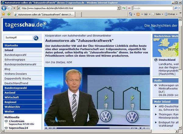 Im Rampenlicht stand insbesondere die Energiepartnerschaft von LichtBlick und Volkswagen. Sie sieht vor, dass LichtBlick bis 2020 bundesweit 100.000 „ZuhauseKraftwerke“ mit einer konstanten elektrischen Leistung von jeweils 20 kW zu einem virtuellen Kraftwerk mit 2000 MW zusammenschaltet. Die von Volkswagen produzierten Mini-BHKW mit Erdgasmotor ersetzen zugleich die komplette Heizungsanlage in Gebäuden mit einem Gasverbrauch ab 45.000 kWh/a und sind nicht auf hohe Laufzeiten, sondern auf die Erzeugung von besonders teurem Spitzenlaststrom ausgelegt. Regellast anbieten zu können, ist schon heute ein lukratives Geschäft und wird es durch den Ausbau der Wind- und PV-Stromerzeugung auch bleiben. Insbesondere wenn man die dabei entstehende Abwärme verkaufen kann. Das unternehmerische Risiko trägt LichtBlick: Die Kunden vermieten an den Energieversorger ihren Keller zur BHKW-Installation und stellen das Gebäude im Rahmen eines Wärmeliefervertrags als Wärmesenke zur Verfügung und erhalten zudem einen (geringen) Bonus auf die erzeugte Strommenge.