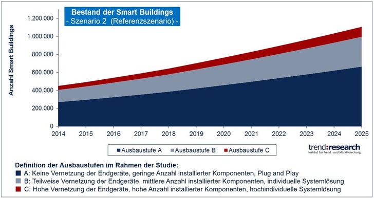 Während der Einsatz intelligenter Gebäudeautomatisierung im Bereich der Privatanwender seit einiger Zeit deutliche Zuwächse zu verzeichnen hat, ist der Einsatz in gewerblich genutzten Gebäuden (Smart Buildings) weniger bekannt. Bis 2025 ist jedoch mit einem großen Nachfragezuwachs zu rechnen, insbesondere aufgrund der gesetzlichen Vorgaben zur Energieeffizienz. Die aktuell erstellte Studie „Smart Building – Intelligente Gewerbe- und Industriegebäudeautomation in Deutschland bis 2025“ von trend:research zeigt Wachstumspotenziale in drei Szenarien, die derzeit bestehenden Unsicherheiten sowie die Anforderungen und bisherigen Erfahrungen bei den Anwendern auf.