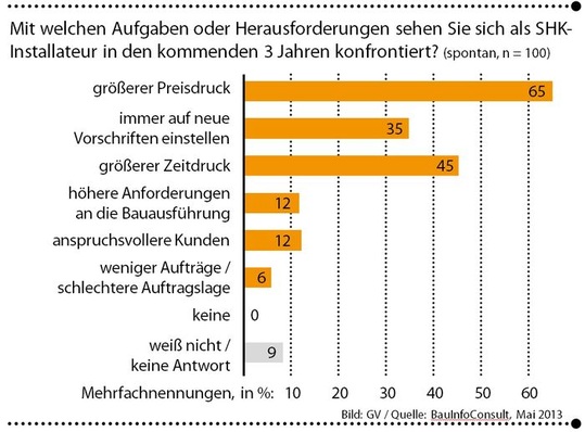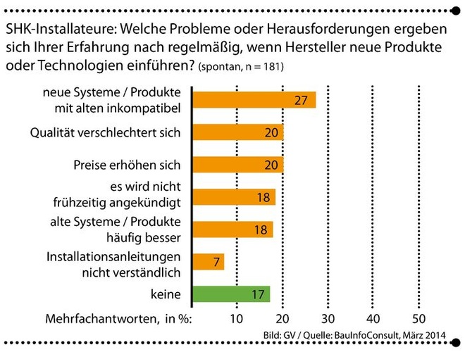 Jeweils ein Fünftel der Befragten gaben spontan an, dass sie sowohl eine geminderte Qualität, als auch erhöhte Preise bei Produktneuheiten festgestellt haben. Jeweils 18 % bemängelten, dass sie über neue Produkte nicht frühzeitig genug informiert werden oder – was für die Hersteller bedenklich ist – dass die alten Systeme und Produkte schlichtweg besser sind. 17 % der Befragten SHK-Installateure sahen keine Probleme bei der Einführung neuer Produkte. ■