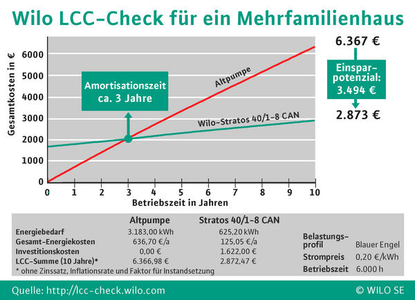 In dem Programm wird entweder die Bestandspumpe aus einem Katalog ausgewählt oder mit Daten des Typenschilds beschrieben. Dann schlägt Wilo-LCC-Check den Betriebspunkt der Bestandspumpe vor, welcher entweder übernommen oder mithilfe von Gebäude- und Anlagendaten neu berechnet wird. Dieser Schritt ermittelt überschlägig inwieweit die Bestandspumpe überdimensioniert ist und sichert ein zusätzliches Einsparpotenzial, da die neue Wilo-Hocheffizienzpumpe jetzt bedarfsgerecht ausgelegt wird. Abschließend erfolgt die Eingabe der Anschaffungs- und Montagekosten zur Ermittlung der Amortisationszeit. ToR