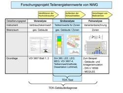 TEK wurde für die schnelle energetische Analyse von komplexen Gebäuden im Bestand konzipiert. Ziel ist es, die Verbrauchsstruktur transparent zu machen, die energetische Qualität von Gebäude und Anlagen zu bewerten und energetische Schwachstellen aufzudecken. TEK kann auch zur Analyse von vielen Gebäuden in einem Portfolio genutzt werden. Die sinnvolle Anwendung erfordert bauphysikalische und technische Querschnittskenntnisse, wie sie typischerweise ein Energieberater hat. ■