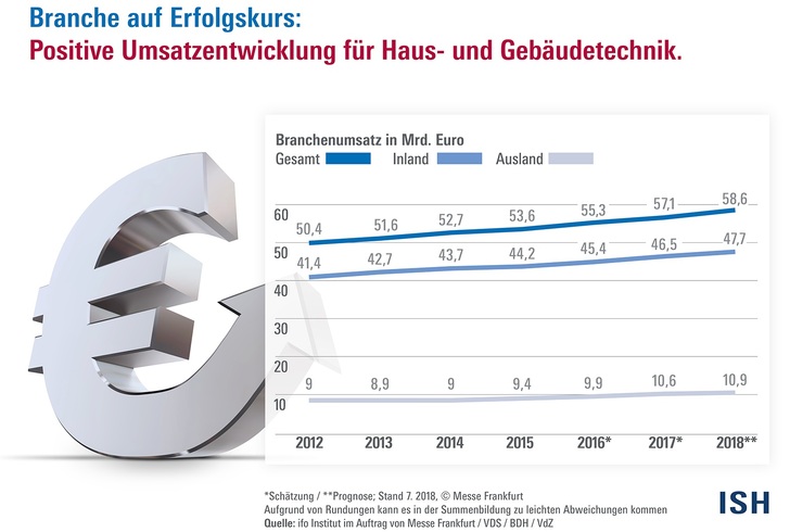 Für den SHK-Branchensektor blickt das ifo Institut in eine weiterführend positive Zukunft. So erwartet das Institut 2018 einen weiteren Umsatzanstieg im Bereich der Haustechnik-Wirtschaft – dann um 2,7 % auf rund 59 Mrd. Euro. In Bezug auf die realen Hochbauinvestitionen prognostiziert das ifo Institut eine Steigerung des Umsatzes von 1,4 %. Begünstigt wird die Entwicklung von einem bundesdeutschen Wirtschaftswachstum in Höhe von 1,8 prognostizierten Prozentpunkten. Dies lässt sich aus der ifo Konjunkturprognose vom Juni 2018 erkennen.