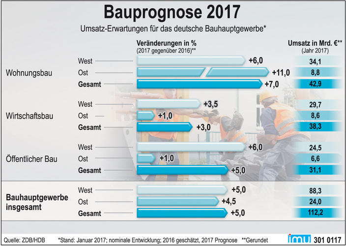 HDB-Präsident Dipl.-Ing. Peter Hübner und ZDB-Präsident Dr.-Ing. Hans-Hartwig Loewenstein gehen auch für 2017 von einem Wachstum in allen Bausparten aus, wenn auch auf unterschiedlich hohem Niveau. Treiber der Entwicklung wird der Wohnungsbau mit einem Umsatzwachstum von 7 % bleiben.