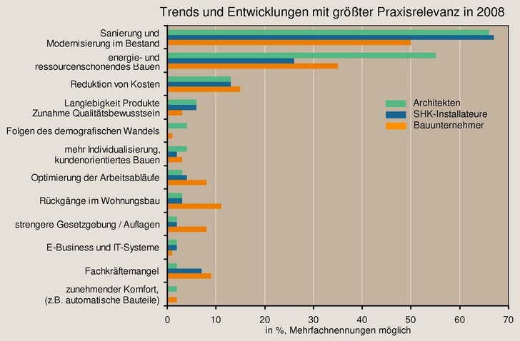 Im Gegensatz zu den SHK-Installateuren und den Architekten ist die Sanierung und Modernisierung für weniger Bauunternehmer die Entwicklung mit der größten Praxisrelevanz in 2008: Jeder Zweite bestätigt hier, dass dieses Thema im laufenden Jahr die tägliche Arbeit besonders stark beeinflussen wird. Auch das energie- und ressourcenschonende Bauen ist ein Aspekt der von weniger, nämlich knapp 35% der Bauunternehmer, als Entwicklung mit einer großen Bedeutung für die Praxis benannt wird. Ein möglicher Grund: Wenn der Bauunternehmer nicht gerade auch Planungsleistungen zu seinem Portfolio zählt, wird die Einsparung von Ressourcen und die Realisierung eines Objektes mit geringem Energieverbrauch bereits in der Planungsphase thematisiert und festgelegt. ToR