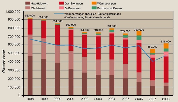 Für Wärmeerzeuger mit Gas und Heizöl (insgesamt 518.000) lag 2008 das Wachstum mit 7% deutlich unter dem des Gesamtmarkts. Dabei stiegen die Stückzahlen für Brennwerttechnik auf 366.000 (+20% gegenüber 2007), während sie für Niedertemperaturtechnik auf 152.500 (-15% gegenüber 2007) gesunken sind. Gas-Brennwerttechnik erreichte einen Anteil am Gesamtmarkt von 50% (2007: 49,3%), insgesamt dominierte der Energieträger Gas (im wesentlichen Erdgas) mit 67,2% (2007: 69,7%) den Markt. Öl-Brennwerttechnik eroberte mit 58.500 Heizkesseln einen Marktanteil von 9,5% (2007: 6,7%), der Marktanteil des Energieträgers Heizöl ist aber von 18,6% in 2007 auf nun 17,0% (105.000) gesunken. Zehn Jahren zuvor hatte Heizöl noch einen Marktanteil von 28,1%.