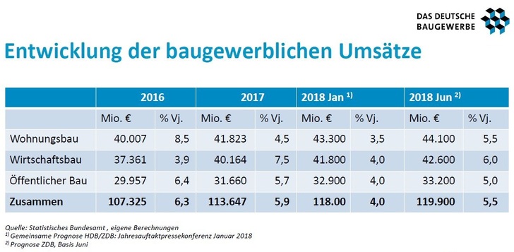 Der Umsatz im Wirtschaftsbau (Hoch- und Tiefbau) liegt in den Betrieben mit mehr als 20 Beschäftigten per Juni bei gut 15 Mrd. Euro (+9,5 %). Ein Plus von gut 11 % im Auftragseingang per Juni wirft ein Schlaglicht auf die nun schon lange anhaltende und hohe Kapazitätsauslastung der deutschen Wirtschaft. Für 2018 erwartet der ZDB im Wirtschaftsbau ein Umsatzplus von 6 % auf 42,6 Mrd. Euro und für 2019 ein ähnliches Umsatzwachstum von rund +5 %.“