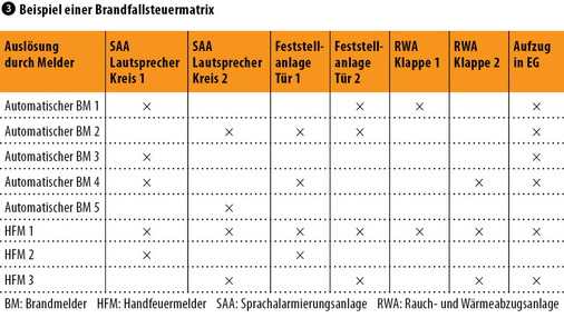Für die Ausführung und weitere Bearbeitung hat es sich bewährt, die vorab ausformulierten Zusammenhänge in einer Matrixform, der Brandfallsteuermatrix Abb. 3 , wiederzugeben. Je nach Komplexität kann es dabei zur besseren Übersichtlichkeit sinnvoll sein, bereichsbezogene Untermatrizen, beispielsweise nach Etagen, Gebäudeflügel oder Brandabschnitten, anzulegen.