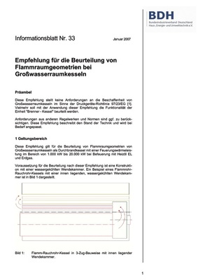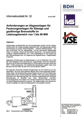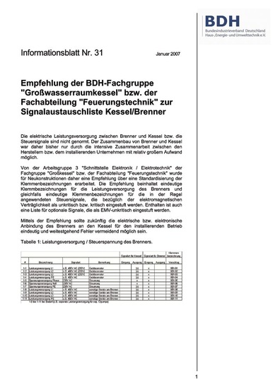 Der Bundesindustrieverband Deutschland Haus-, Energie- und Umwelttechnik (BDH) hat drei neue Informationsblätter veröffentlicht. BDH-Informationsblatt 31 Empfehlung zur Signalaustauschliste Kessel/Brenner behandelt die eindeutige Klemmenbezeichnung zur Leistungsversorgung und für die üblichen Steuersignale. BDH-Informationsblatt 32 Anforderungen an Abgasanlagen für Feuerungsanlagen für flüssige und gasförmige Brennstoffe im Leistungsbereich von 1 bis 50 MW enthält Empfehlungen für die Ausführung von Abgasanlagen, die einen störungsfreien Betrieb einer Feuerungsanlage gewährleisten. BDH-Informationsblatt 33 Empfehlung für die Beurteilung von Flammraumgeometrien bei Großwasserraumkesseln zeigt, wie die Funktionalität einer gewählten KesselBrenner-Einheit beurteilt werden kann.