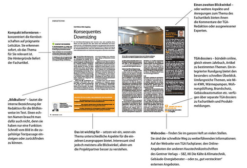 Kompakt informieren – konzentriert die Kernbotschaften auf prägnante Leitsätze. Sie erkennen sofort, ob das Thema für Sie relevant ist. Die Hintergründe liefert der Fachartikel.„Bildkullern“ – lautet die interne Bezeichnung der TGA-Redaktion für die Bildhinweise im Text. Einen echten Namen braucht man dafür auch nicht, denn sie haben nur eine Funktion: Schnell vom Bild in die zugehörige Textpassage einsteigen oder zurückfinden zu können.