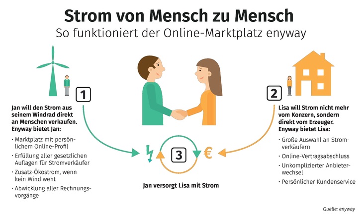 Stromverkäufer (Besitzer von Stromerzeugungsanlagen) erstellen auf dem Online-Marktplatz ihr Profil mit Video, Fotos und Texten und präsentieren so ihre Anlagen und ihr Angebot. Varena Junge (29), Mitgründerin des Internet-Unternehmens: „Auf enyway werden die Menschen und Motivationen sichtbar, die hinter jedem Windrad und jeder Solaranlage stehen. Strom bekommt damit erstmals ein Gesicht und eine individuelle Geschichte.“
