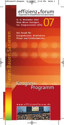 Die neue Kongressmesse effizienz.forum 2007 richtet sich mit Fachvorträgen, Workshops und einer begleitenden Fachausstellung an alle, die sich mit Gebäudeenergieeffizienz beschäftigen: Gebäudeenergieberater, Haustechnik-Planer, Architekten und Fachhandwerker. Veranstaltungsort am 8. und 9. November 2007 ist das Internationale Congresscenter (ICS) in der Neuen Messe Stuttgart.
