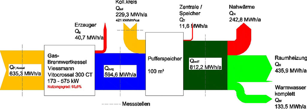 Genug von der Theorie? Dann hier ein Praxisbeispiel: Wie Messungen an Solarthermie-Anlagen für Mehrfamilienhäuser und an solaren Nahwärmesystemen für eine Einfamilienhaussiedlung Abb. 1 Abb. 2 [2] zeigen, können die gemessenen Solarerträge die dafür zusätzlich auftretenden Speicher- und Verteilverluste geringfügig übersteigen, sodass tatsächlich in geringem Umfang Endenergie, also Erdgas oder Heizöl, eingespart wird. Im Mittel aller untersuchten Feldanlagen waren das 6 bis 7 kWh/(m 2 a). In manchen Fällen kommt es jedoch auch zu einem „Nullsummenspiel“ oder sogar zu einem höheren Endenergieverbrauch als ohne Solarnutzung. Bei einem System mit solarer Nahwärme war der Solarertrag geringer als die zusätzlichen Speicher- und Nahwärmeverteilnetzverluste [3].