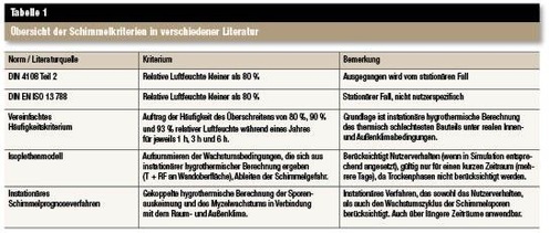 Auf der Grundlage dieser Abhängigkeiten sind geeignete Kriterien zur Bewertung der Schimmelgefahr definiert worden. Da das Substrat im Allgemeinen nur schwer zu beeinflussen ist und der für den Schimmel günstige Temperaturbereich den üblicher Innenraumtemperaturen einschließt, ist es das Feuchteangebot, das zumeist begrenzt wird. In den Normen DIN 4108 Teil 2 und DIN EN ISO 13788 findet man daher einen Grenzwert von 80 % für die relative Luftfeuchte an der Wandoberfläche (entspricht einem Temperaturfaktor 1) von 0,7). Dieser Wert sollte im stationären Fall für das thermisch ungünstigste Bauteil (Wärmebrücke) nicht überschritten werden. Allerdings sind die Normen im Allgemeinen nur für den Neubau bzw. hinreichend umfangreiche Sanierungen verbindlich und damit für die Bewertung eines Schadensfalles nur bedingt aussagefähig.
