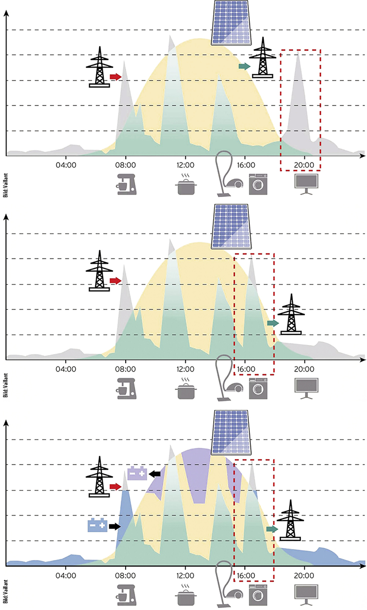 Die Lösung bieten bereits seit einigen Jahren Batteriespeicher für den Hausgebrauch an. Betrachtet man typische Erzeugungs- und Verbrauchsprofile in einem Einfamilienhaus, wird schnell deutlich, wie wichtig Batteriespeicher unter den aktuellen und künftig wahrscheinlich noch weiter verschärften Bedingungen für die Einspeisung von PV-Strom sind Abb. 2. Gerade dann, wenn viel Strom erzeugt wird, wird er in der Regel nicht benötigt – selbst dann, wenn man relevante Verbraucher, wie Wasch- oder Spülmaschine, zu den Zeiten mit „überschüssiger Erzeugung“ betreibt. Ist dagegen der Strombedarf hoch, wird von der PV-Anlage Strom noch nicht oder nicht mehr produziert.