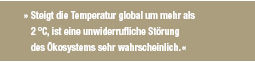 In ihrer Mitteilung beschreibt die EU-Kommission den Klimawandel als Realität und stellt klar, dass dringend gehandelt werden muss. Erst eine Begrenzung des Anstiegs der globalen Durchschnittstemperatur auf weniger als 2 °C über dem vorindustriellen Niveau begrenze die Wahrscheinlichkeit, dass das globale Ökosystem massiv und unwiderruflich gestört werde. Dazu müssten die CO 2 -Emissionen drastisch reduziert werden. Das Problem: Selbst wenn Europa seine Treibhausgasemissionen von heute auf morgen - ohne sie zu exportieren - vollständig beendet, ist das 2 °C-Ziel nur durch eine globale Initiative zu erreichen. Doch wie überzeugt man die anderen Länder?