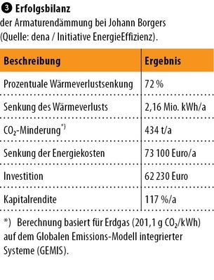 Allein die Matratzendämmung der insgesamt 300 Armaturen des Thermalöl-Systems im Borgers Werk in Hamminkeln-Dingden senkte die Energieverluste der gesamten Anlage von zuvor 2,98 auf 0,82 Mio. kWh/a. Der Produktionsstandort spart damit mehr als 73000 Euro/a bei den Energiekosten und hat seine CO 2 -Bilanz um 430 t/a verbessert Abb. 3 . Hinzu kommen Einspareffekte bei der Belüftung der Fertigungshallen: Da durch das Beseitigen der Wärmebrücken in den Rohrleitungsnetzen erheblich weniger Wärme an die Umgebung abgegeben wird, konnte auch der Volumenstrom der Raumlufttechnik gesenkt werden.
