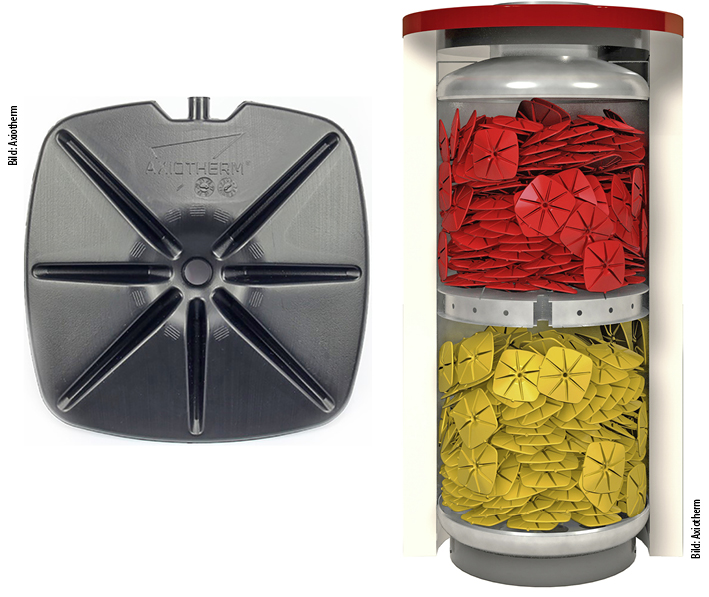 Nach den eher zurückhaltenden Aussagen der Wissenschaftler, was Marktreife und Anwendungsspektrum anbelangt, gab Dirk Büttner, Axiotherm, Eisenberg in Thüringen, einen Ausblick, was heute mit PCM schon alles möglich ist. Der Kunststoffverarbeiter und Blasformenspezialist hat nach eigenen Angaben bereits seit 50 Jahren Erfahrung mit PCM. So bietet Axiotherm seine PCM-Linsen, sogenannte Heatsels Abb. 7, mit 180 bzw. 270 mm Durchmesser, für den Temperaturbereich von – 40 bis + 90 °C an. Mit dieser Bandbreite lassen sich maßgeschneiderte PCM-Lösungen für Kälteanlagen, Kühlung und Klimatisierung, Solartechnik, Wärmepumpen und BHKW entwickeln.