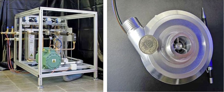 Um die Entwicklung von Niederhub-Anlagen voranzutreiben, wurde in Zusammenarbeit mit der Celeroton AG, Zürich, und der ETH Zürich der Prototyp eines Radial-Turboverdichters (Kältemittel Butan, R600) mit einer elektrischen Leistungsaufnahme von 1,5 kW bei einer thermischen Leistung von etwa 10 kW realisiert Abb. 1 . Experimentelle Untersuchungen zeigten, dass damit bislang „unerreichbar hohe Gütegrade“ möglich sind mit einem COP Heizen von 9,2 und einem Gütegrad von 59,6 %. Eine für Kühlen ausgelegte Anlage erreichte einen COP von 13,4 bei einem Gütegrad von 58,6 %. Für die hohe Energieeffizienz sind die Abstimmung des Geräts mit dem Heiz- bzw. Kühlsystem sowie die Optimierung der Hilfsaggregate entscheidend, so Wellig. Die Ergebnisse sind so überzeugend, dass die Entwicklung zusammen mit der BS2 AG, Schlieren-Zürich, fortgesetzt werden soll.