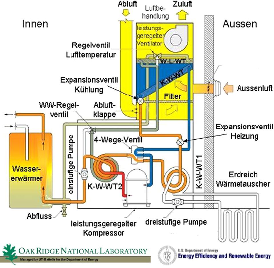 Wie eine integrierte Wärmepumpen-Systemlösung künftig aussehen könnte, verdeutlicht eine vom US-amerikanischen Oak Ridge National Laboratory entwickelte Erdreich/Luft-Wärmepumpe mit integriertem Luftbehandlungsgerät, Wärmerückgewinnung, Luftentfeuchtung und Trinkwassererwärmung Abb. 4. Durch den Einsatz leistungsgeregelter Komponenten und die Integration mehrerer Funktionen könnten Einsparpotenziale von rund 50 % gegenüber der marktverfügbaren Standardtechnologie erreicht werden, so Wemhöner.