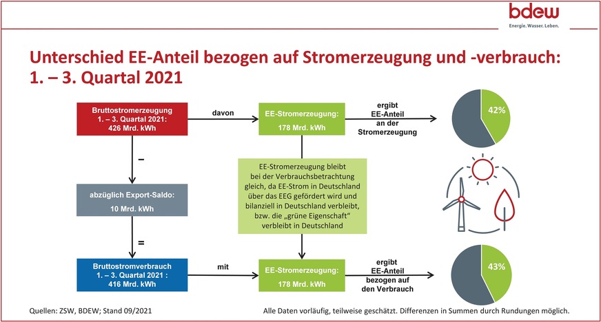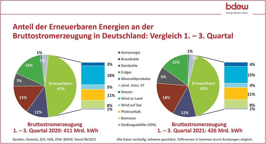 Das Zentrum für Sonnenenergie- und Wasserstoff-Forschung Baden-Württemberg (ZSW) und der Bundesverband der Energie- und Wasserwirtschaft (BDEW) haben erste Zahlen zum Anteil erneuerbarer Energien am Bruttostromverbrauch von Januar bis September 2021 vorgelegt: