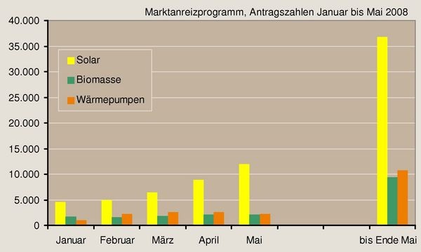 Vom Start weg gut angenommen wird die Förderung effizienter Wärmepumpen. In den ersten fünf Monaten wurden dazu 10684 Anträge an das Bundesamt für Wirtschaft und Ausfuhrkontrolle ( BAFA ) gerichtet. Im Mai konnte die Steigerung der ersten vier Monate allerdings nicht fortgesetzt werden. Bleiben die Antragszahlen für Wärmepumpen das gesamte Jahr auf dem Mai-Niveau (2184), summieren sich bis zum Jahresende knapp 26.000 Anträge. Mit der gleichen linearen Fortschreibung hatten wir auf Basis der Zahlen bis Ende März noch 30.000 Anträge berechnet. Traditionell stark im Verkauf war in den letzten Jahren aber immer der Herbst. Die deutlich gestiegenen Brennstoffpreise könnten auch in diesem Jahr für einen entsprechenden Schub sorgen.