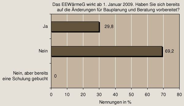Jahrlange wurde leidenschaftlich über ein Wärmegesetz gestritten. Nun ist es verabschiedet und bis das EEWärmeG ( Gesetzestext (PDF, 0,1 MB, geschützt) ) greift, sind es nur noch wenige Wochen. Bisher hat das aber nur rund 30% der Teilnehmer unserer Online-Umfrage (Mitte September bis Mitte Oktober) veranlasst, sich auf das EEWärmeG vorzubereiten. 70% haben dies noch nicht getan. Maßgeblich für die Anwendung des Gesetzes ist die Stellung der Bauantrags bzw. der Bauanzeige nach dem 31. Dezember 2008, laufende Planungen können also bereits betroffen sein.