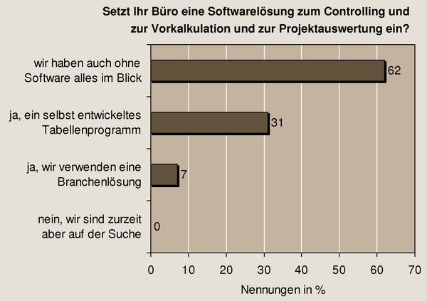 Bei unserer letzten Umfrage haben wir gefragt: Wie behalten Sie den Überblick über Honorare, Nebenkosten, Sonderleistungen, Auslastung… Wird in Ihrem Planungsbüro eine Softwarelösung zum Controlling und zur Vorkalkulation und Projektauswertung eingesetzt?