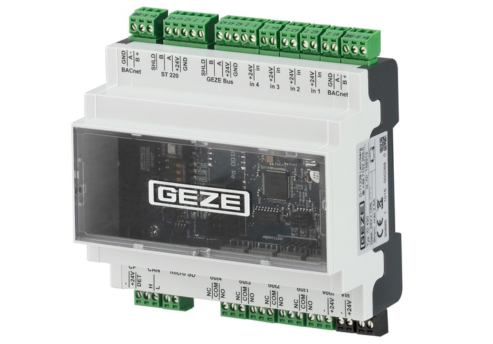 Geze, 9.0-D21: Das Schnittstellenmodul IO 420 vernetzt Türsysteme, Türtechnik, Feststellanlagen, Lüftungstechnik, Rauch- und Wärmeabzugsanlagen sowie Sicherheitssysteme des Unternehmens über BACnet miteinander und ermöglicht ihre Integration in die Gebäudeleittechnik. www.geze.com